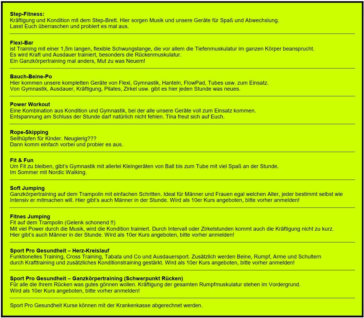 Jumping, Step-Aerobic, Flexi Bar, Pilates,